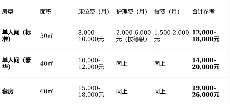 注:具体收费根据护理等级(自理/半护/全护/特护)评估确定,认知症照护费用单独核算。