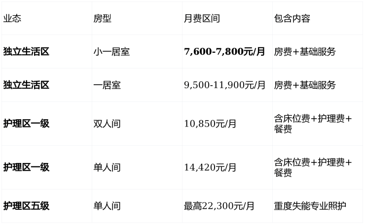 注:餐费约1,800元/人/月;2024年3月纳入长护险协议机构,部分费用可医保报销