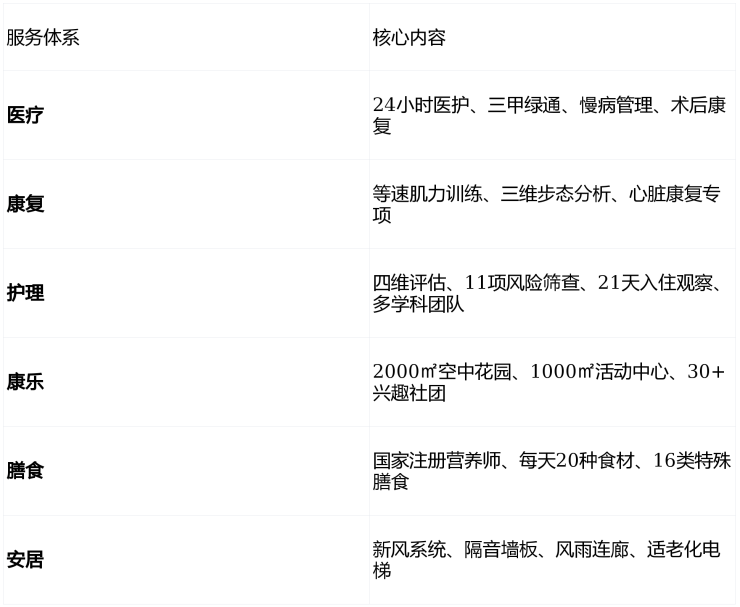 "大家的家"深度融合加拿大RC(Retirement Concept)护理服务体系及日本MCS(美邸)认知症照护经验,结合中国长者需求,打造"医疗、康复、护理、康乐、膳食、安居"六大服务体系