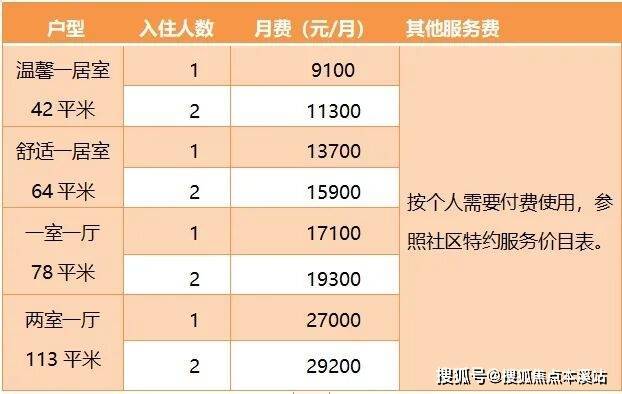 护理费用:11850元——19200元/月/人,具体费用需根据护理等级和房型决定。