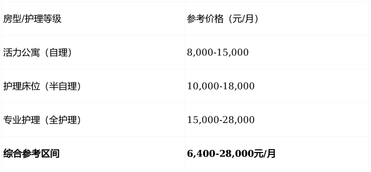 护理费:按等级收取,半自理增加2,000-4,000元/月,全护理最高20,000元/月