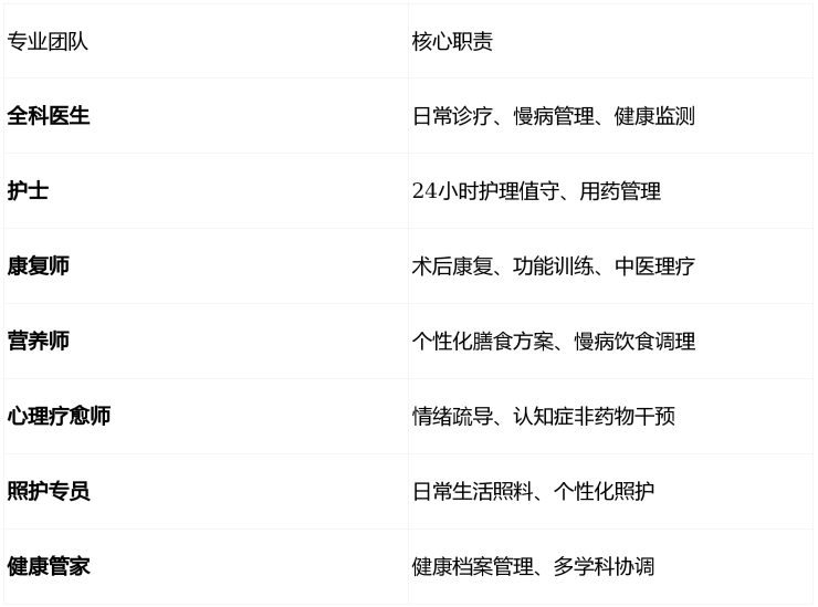 合悦家创新引入"1+N"多学科照护模式,每位长者配备专属七大私人医护团队