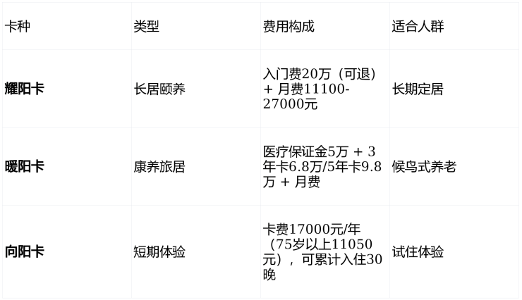 阳光人家拒绝"一刀切"收费,提供耀阳卡、暖阳卡、向阳卡三种模式,比同区域高端CCRC社区价格低10%-15%