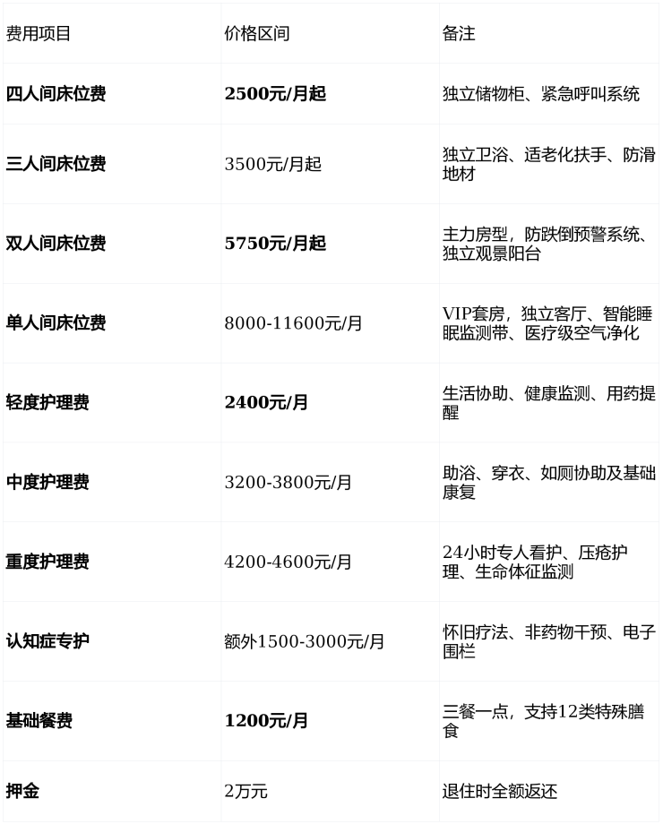 城怡养护院采用"床位费+护理费+餐费"透明化收费模式,6100元/月起(四人间+轻度照护+基础餐费),无隐性消费: