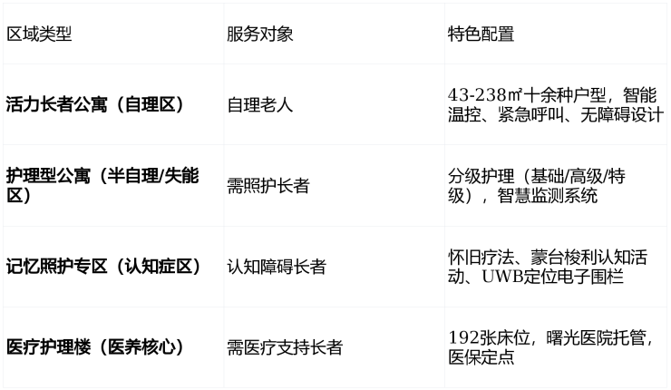 快乐家园突破传统养老机构单一功能,由6栋合院、4栋小高层公寓、1栋医疗护理楼及1栋综合配套楼组成,提供从居家养老到安宁疗护的全周期服务: