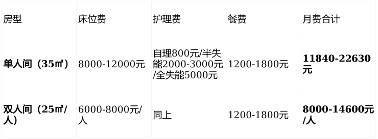 自理型:7250-12000元/月(一费全包:三餐+水电+基础服务)