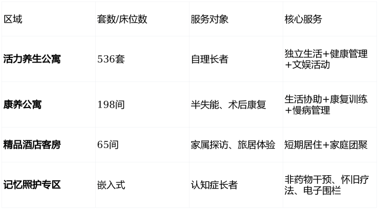 总建筑面积:14万㎡ | 养老单元:536套养生公寓+198间康养公寓+65间精品酒店客房 | 规划床位:1500张(一期)/3000张(二期2026年投运后)