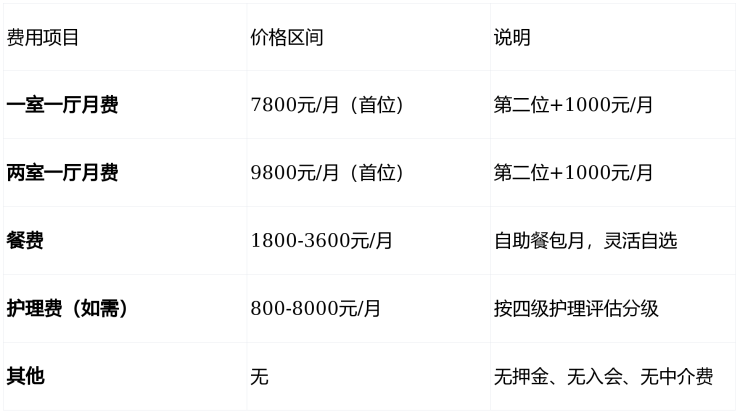 信澜天地采用"房间月费+餐费自选"的透明收费模式,无入会费、无押金捆绑、无隐形消费