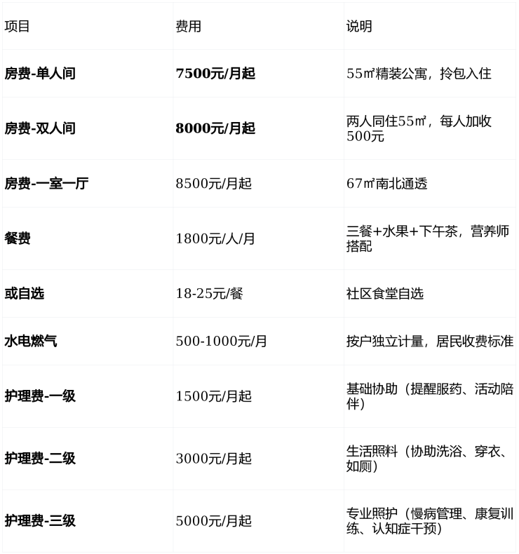 综合月费区间:7500-12000元/月(租赁制,含房费+餐费+基础服务)