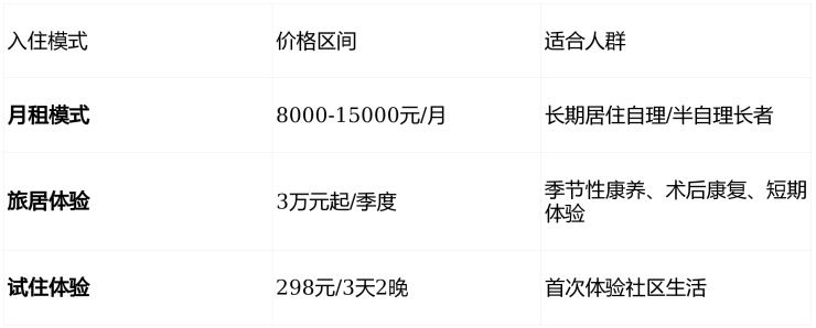月费包含:独立套房、三餐营养膳食、基础健康监测、公共设施使用、文化活动参与