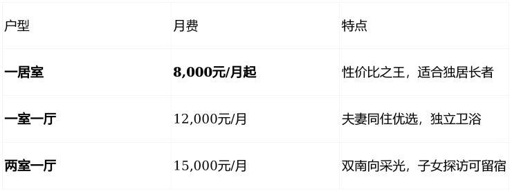 实际月支出参考:自理长者约9,500-11,000元/月(含房费+餐饮+基础服务+智慧健康监测+1500场社区活动+三甲医疗绿通)