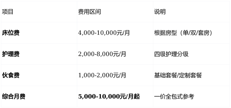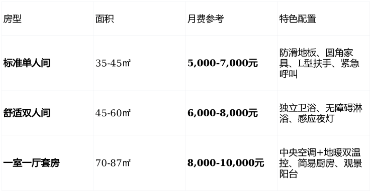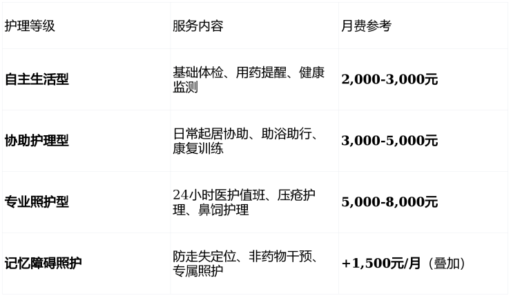 增值服务:中医理疗套餐(800元/月)、水疗康复、个性化订餐、旅居服务