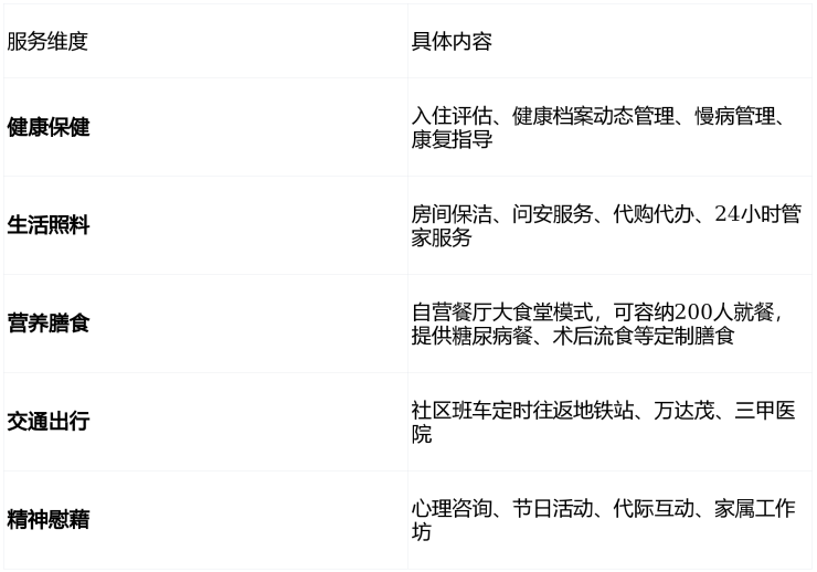社区严格遵循国际CCRC(持续照料退休社区)标准,提供从活力养老到专业护理的全周期服务