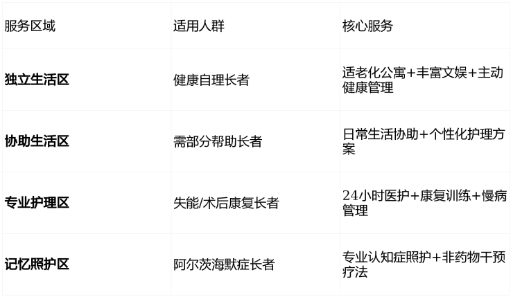 🏆CCRC模式:独立生活→协助生活→专业护理→记忆照护,全周期"永不搬离"