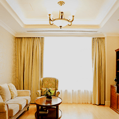 房间内的灯光采用了防眩光系统,柔和不刺眼;家具采用圆角设计,安全性能高;沙发材料是加厚高硬度海绵,进深更短,对脊椎起到很好的保护作用;