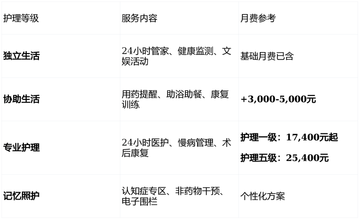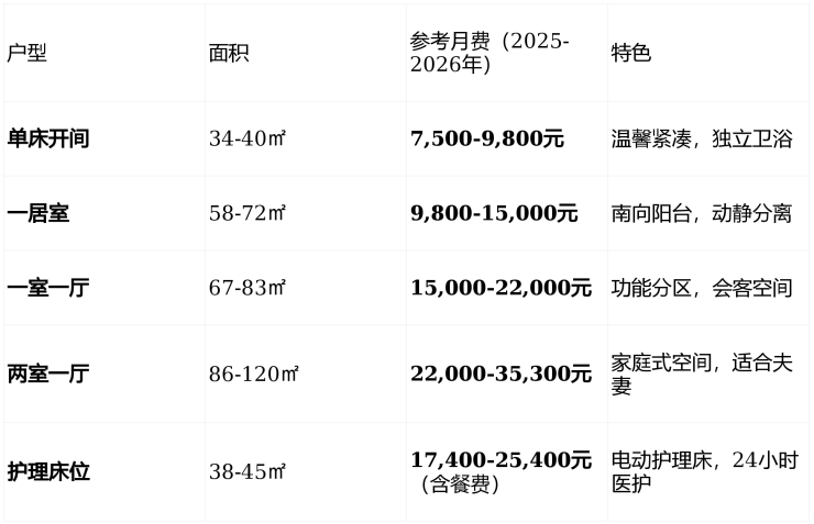 注:费用因户型、护理等级、朝向不同而异;双人入住第二人月费约+2,600元;餐费约1,800-2,000元/人/月;押金4万元(可退还)
