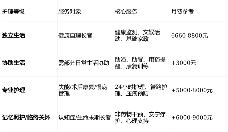 "一次选择,终身守护"——从独立居住到临终关怀的一站式服务。