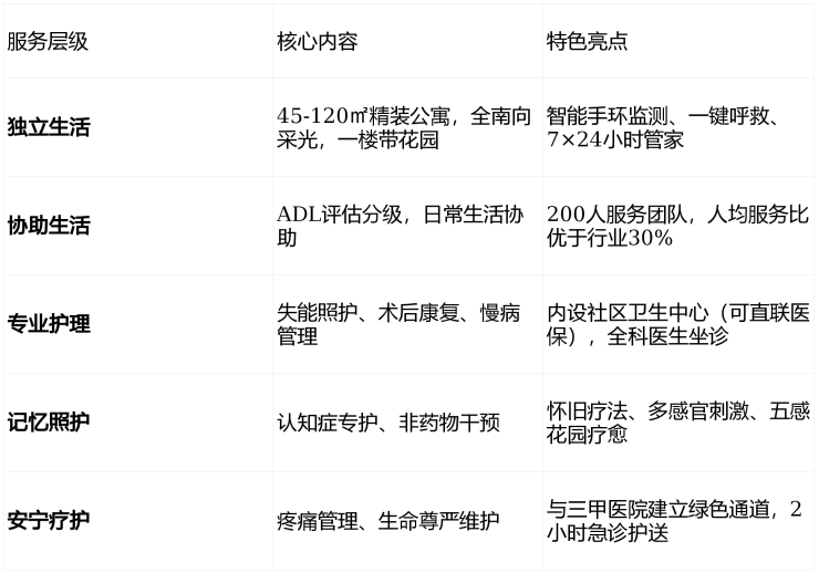澳朵花园严格遵循国际CCRC(持续照料退休社区)标准,提供覆盖全生命周期的五级服务: