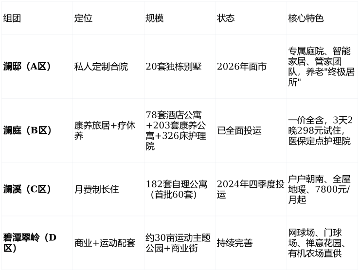 ✅全周期业态:四大组团(澜邸/澜庭/澜溪/商业),从旅居到长住,从自理到护理,一站式不换房