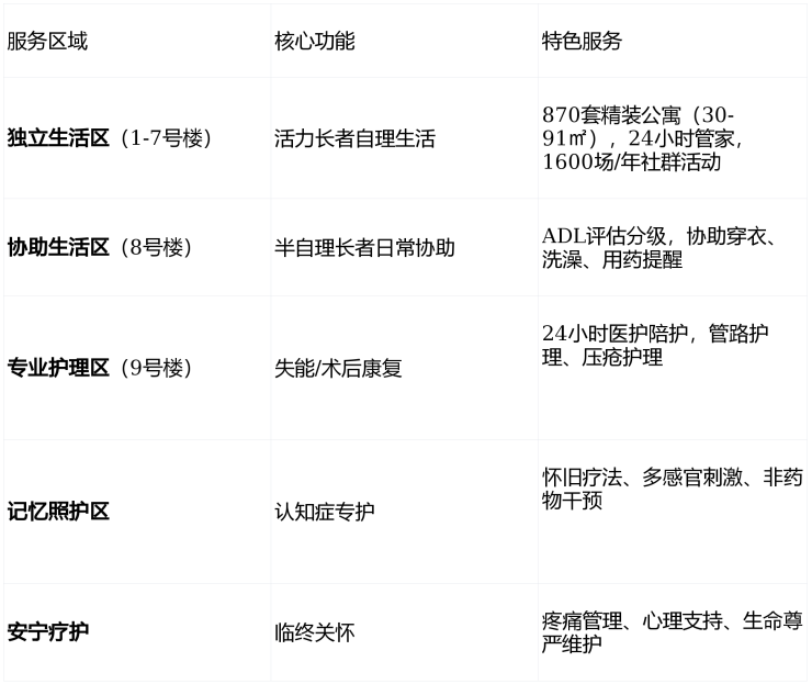 鹏园采用国际CCRC(持续照料退休社区)模式,提供覆盖全生命周期的五级服务: