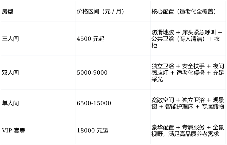 认知症专护(核心亮点):5500-8000 元 / 月(封闭式动线管理 + 防走失门禁 + 蒙台梭利照护法)。
