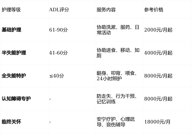 采用ADL(日常生活活动能力)评估体系,精准匹配护理等级: