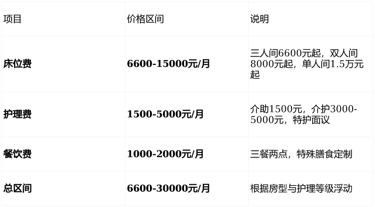 昆仑邸采用模块化计费方式,由床位费+护理费+餐饮费构成,透明无隐形消费