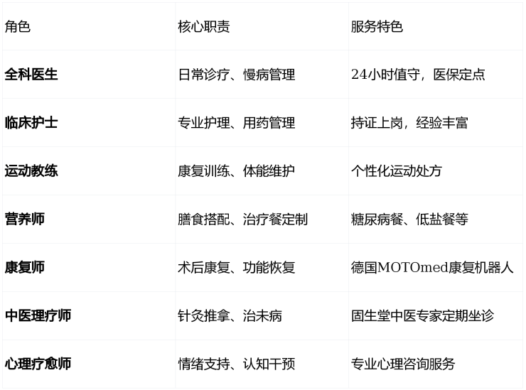 N名专业成员:全科医生、临床护士、运动教练、营养师、康复师、中医理疗师、心理疗愈师